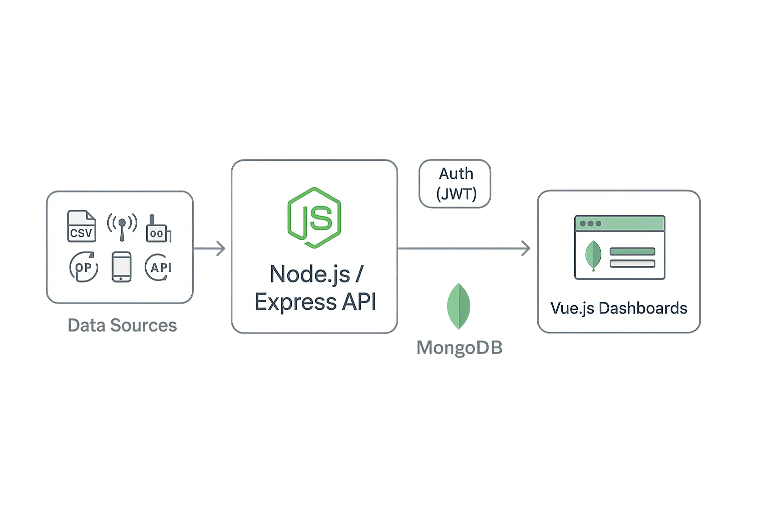 - Frontend (Vue.js): Interactive dashboards, faceted filters, KPI tiles, and exportable reports.